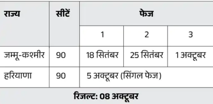 हरियाणा विधानसभा चुनाव की तारीख चुनाव आयोग ने बदल दी है। 90 सीटों पर चुनाव 1 अक्टूबर की जगह अब 5 अक्टूबर को होंगे। इसके अलावा रिजल्ट 8 अक्टूबर को आएंगे। आयोग ने जम्मू-कश्मीर विधानसभा चुनाव के भी नतीजे 8 अक्टूबर को घोषित करने का ऐलान किया है। पहले दोनों राज्यों के नतीजे 4 अक्टूबर को आने वाले थे।